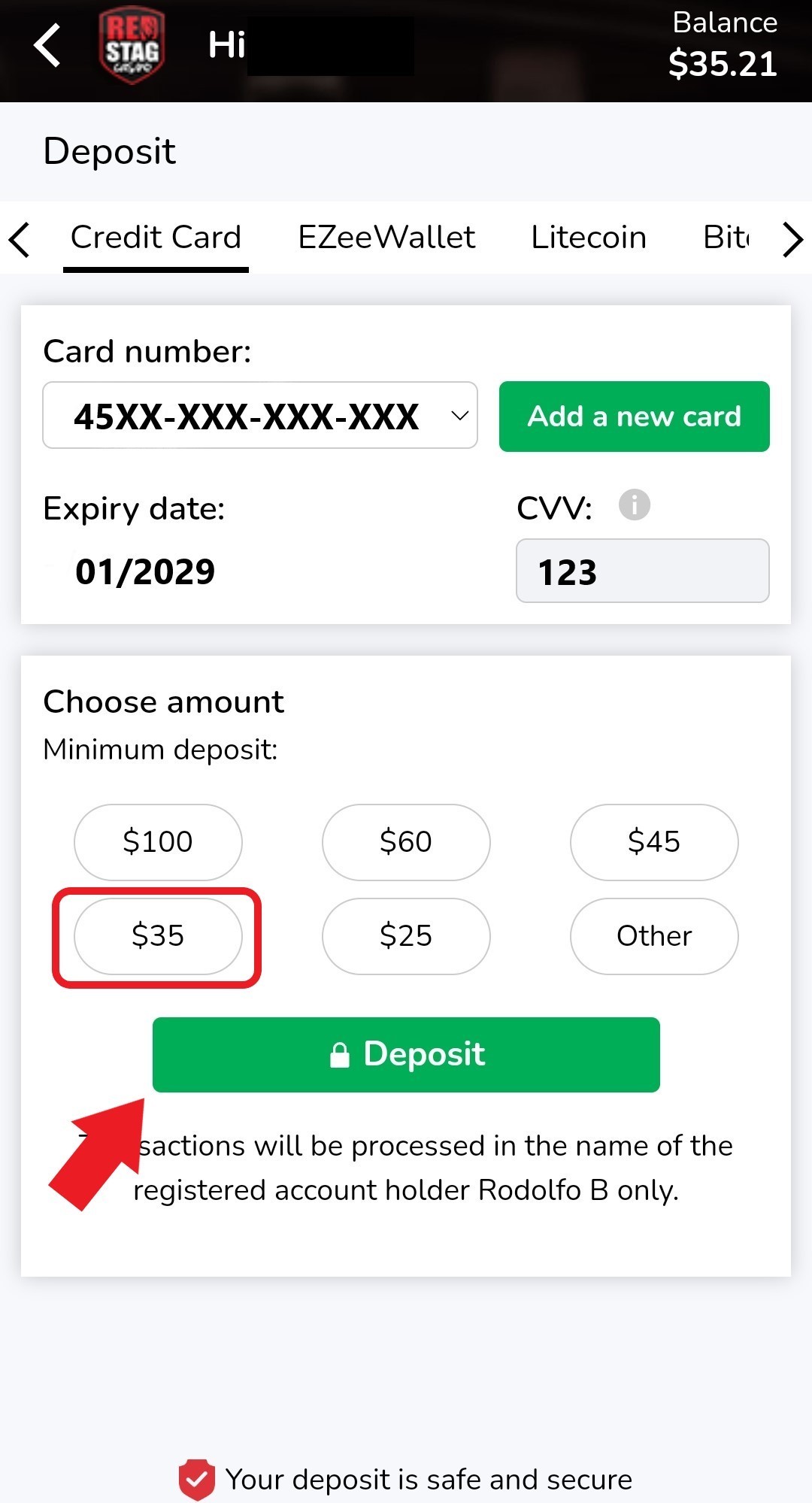 Once you are logged into your account, you are ready to redeem promotions, including your mobile casino boosters. For claiming a match bonus, please click on the Deposit Button at the top of your screen. This action will open the Red Stag Casino cashier page, where you can find all the depositing methods available to you.